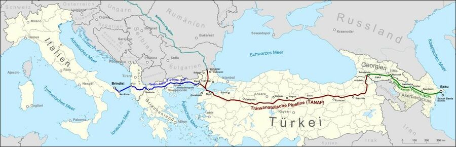 アゼルバイジャン~ジョージア~ギリシャ~イタリア ガスパイプライン(https://en.wikipedia.org/wiki/Trans-Anatolian_gas_pipeline#/media/File:TAP_TANAP_SCP_Schah_Denis.png
