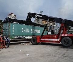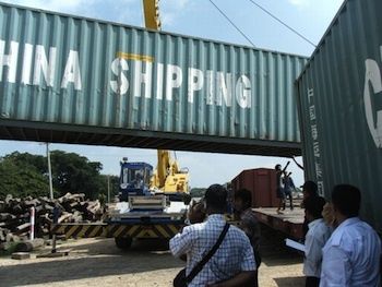 ヤンゴン港に荷揚げされたコンテナをクレーンで積み込む(写真提供:JR貨物)