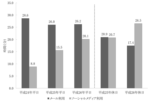 図1 平日・休日のコミュニケーション系メディア利用時間の推移(出所:総務省「平成26年情報通信メディアの利用時間と情報行動に関する調査報告書」)