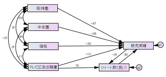 図2 パス解析の分析結果:標準化係数(出所:鶴見ら「商品に関するTwitter上のコミュニケーションと販売実績の関連性分析」)
