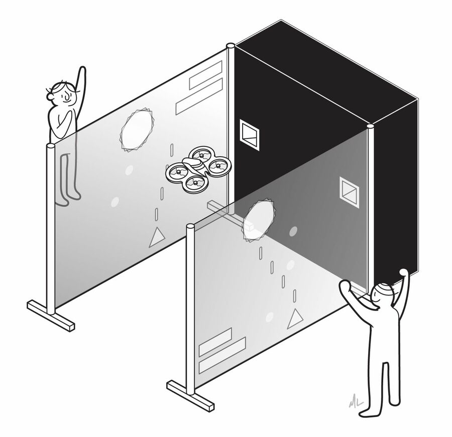 壮観!ドローンが描く未来の空中オーケストラ これからのドローンはどこへ向かうのか・・・。(写真はイメージ) (画像1/2) 中央に浮遊するUFO型ドローン(敵)の動きは、片方のプレイヤーの動きと連動している。反対側にいるプレイヤーは、体の傾きやジェスチャーでスクリーン上の自機を操作して、敵のUFO型ドローンを倒す。 (画像2/2) 壮観!ドローンが描く未来の空中オーケストラ この写真の記事を読む