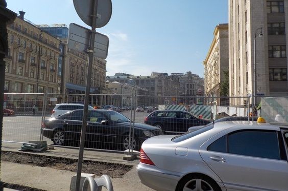 モスクワ最大の繁華街トゥベルスカヤ通りが赤の広場と交わる一等地も、都市改良工事のため、無残な状態である。駐車中の車は、ベンツのタクシー群。モスクワ観光は規律の戻る今年秋以降をお勧めしたい