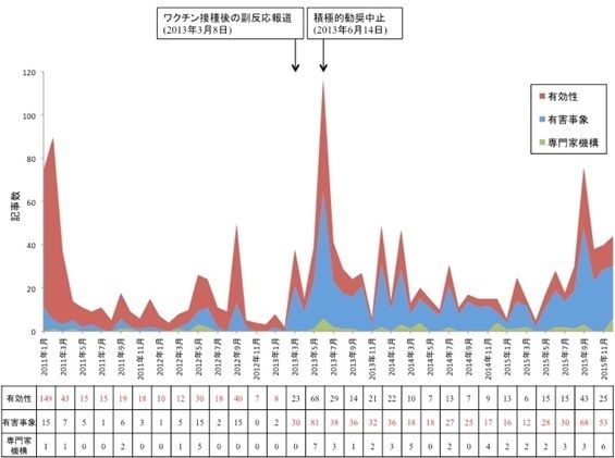 図1 子宮頸がんワクチン報道における、有効性、有害事象、専門家機構に言及した新聞記事数の推移 (Clin Infect Dis. 2016, in press, doi: 10.1093/cid/ciw647より改変)