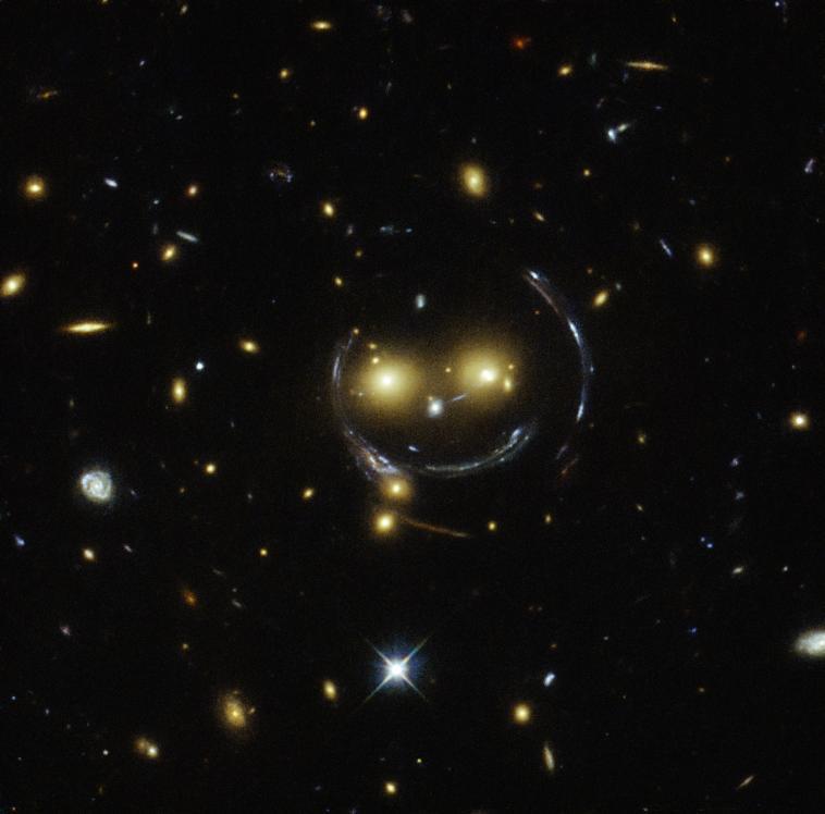 宇宙の謎を一挙に解明?エントロピック重力理論とは ハッブル宇宙望遠鏡が捉えた銀河団「SDSS J1038+4849」。重力レンズの影響で、2つの目と鼻があり微笑んでいるように見える。この中心にダークマターがあるが、写真には写らないと考えられている。(写真:NASA) (画像1/2) 銀河を通過する光線は、銀河の重力によって曲がる。ブラウワー氏のチームはこ の効果を測定して、銀河の質量分布を測定した。 (c) APS/Alan Stonebraker; galaxy images from STScI/AURA, NASA, ESA, and the Hubble Heritage Team. 拡大画像表示 (画像2/2) 宇宙の謎を一挙に解明?エントロピック重力理論とは この写真の記事を読む