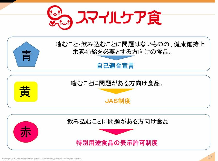 魚の消費が減っても市場拡大していた「骨なし魚」 骨を抜いてある白身魚。高齢化を背景に「骨なし魚」の需要が高まっている。 (画像1/3) 「ユニバーサルデザインフード」のマークの例。(日本介護食品協議会資料より) (画像2/3) 「スマイルケア食」の色による分類と関連する制度。黄色と赤には固さの基準に応じて、数値でも区分けしている。(農林水産省 2016年11月公表「スマイルケア食の取組について」より) 拡大画像表示 (画像3/3) 魚の消費が減っても市場拡大していた「骨なし魚」 この写真の記事を読む