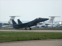 MAKS2011で飛行する米空軍の戦闘機 背景には垂直尾翼にソ連国旗を残す飛行機が見える。