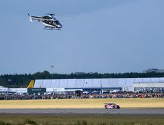 横浜ゴムがスポンサーとなった航空機と自動車のレース 手前のヘリコプターと奥の自動車が競走している。