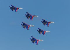 MAKSでのロシア空軍機の飛行 先頭の飛行機は新開発のステルス戦闘機。こうした航空機を追い求めて日本から来るマニアも少なくない。