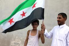 2012年難民としてヨルダンに逃れた反体制派の旗を掲げる人たち