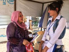 難民キャンプで妊産婦の相談を受けるリーム(右)