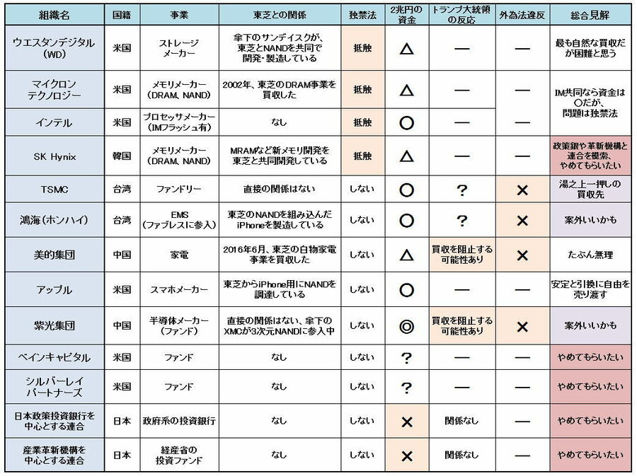 東芝メモリ買収、政策銀や革新機構は出てくるな! 経営危機に陥っている東芝。虎の子の東芝メモリを買収するのはどこか? (画像1/2) 東芝メモリの応札に名乗りを上げている企業や組織 拡大画像表示 (画像2/2) 東芝メモリ買収、政策銀や革新機構は出てくるな! この写真の記事を読む