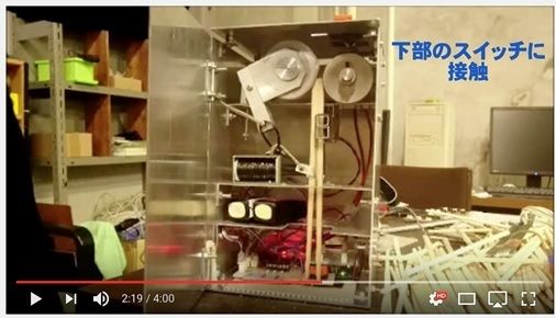 『フルアルミボディ全自動割りばし割り機』箱の上から割り箸を中に吸いこんで、割って吐き出す装置(動画=https://youtu.be/uXCIZl5OD1I