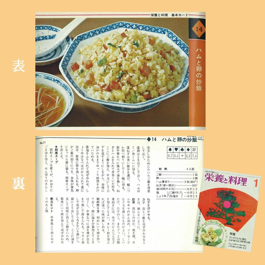 昭和11年のチャーハン、お米の多さにはワケがある 戦前から戦後にかけてチャーハンの作り方はどう変わっていったのだろう。 (画像1/4) 『栄養と料理』1936(昭和11)年12月号の表紙と「栄養と料理カード」。材料は5人前と1人前が併記されている。 拡大画像表示 (画像2/4) 1957(昭和32)年2月号。1人分の熱量は450kcal。昭和11年の約半分に。 拡大画像表示 (画像3/4) 1971(昭和46)年1月号。表面にはカラー写真も。 拡大画像表示 (画像4/4) 昭和11年のチャーハン、お米の多さにはワケがある この写真の記事を読む