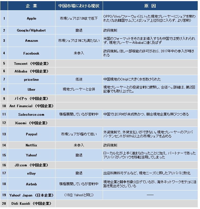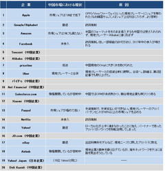 「世界のIT企業20傑」の中国市場での現状(DI作成)