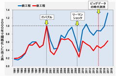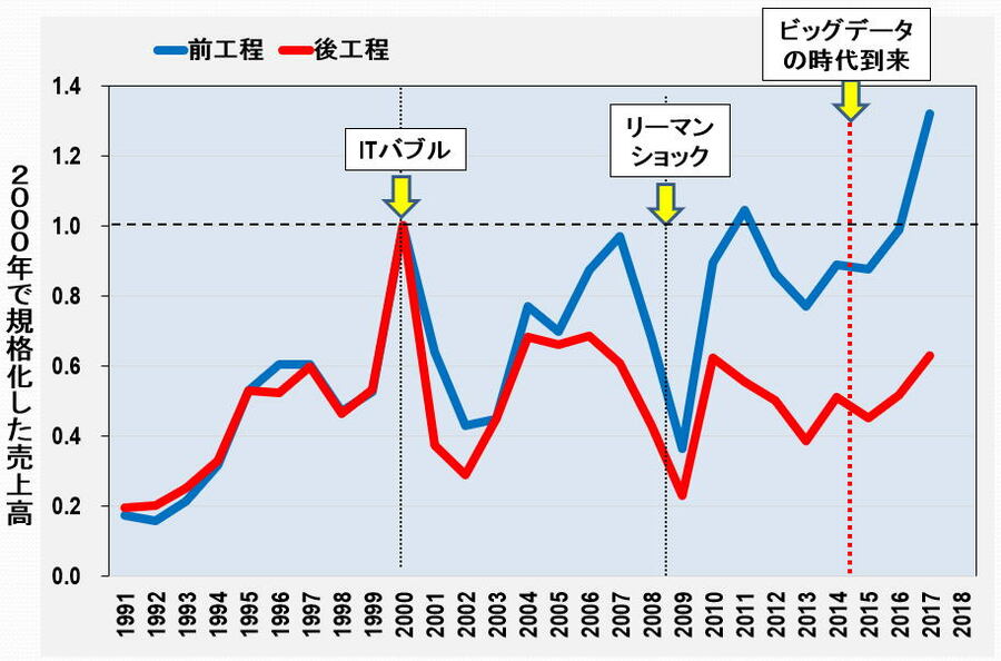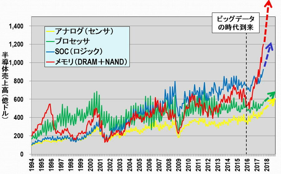 ビッグデータ時代到来、恩恵は斑模様の半導体業界 (画像1/7) 図1 IoTの時代がやってきた(2020年の世界) (画像2/7) 図2 指数関数的に増大するビッグデータ 出所:総務省「ICTコトづくり検討会議」報告書 (画像3/7) 図3 半導体の種類別の月額売上高 出所:日経テクノロジーオンラインのデータ基に筆者作成(ソースはWSTS) (画像4/7) 図4 半導体と製造装置の市場推移 出所:電子ジャーナル『半導体データブック』『半導体製造装置データブック』、筆者の調査による (画像5/7) 図5 2000年で規格化した半導体と装置の市場推移 出所:電子ジャーナル『半導体データブック』『半導体製造装置データブック』、筆者の調査による (画像6/7) 図6 2000年で規格化した前工程と後工程の装置市場推移 出所:電子ジャーナル『半導体データブック』『半導体製造装置データブック』、筆者の調査による (画像7/7) ビッグデータ時代到来、恩恵は斑模様の半導体業界 この写真の記事を読む