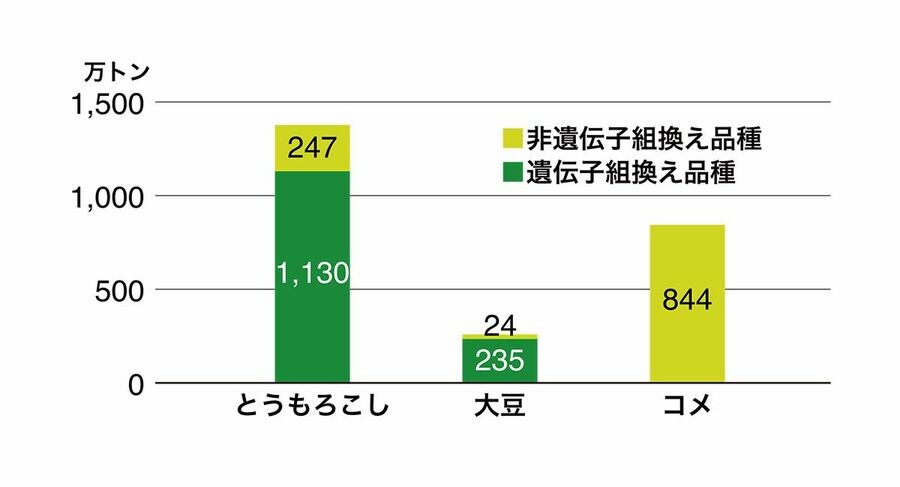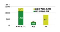 日本の年間穀物輸入量と遺伝子組換え作物の 比率の試算および日本のコメの生産量(くらしとバイオプラザ21「知っておきたいこと〜遺伝子組換え作物・食品編」p7をもとに作成)