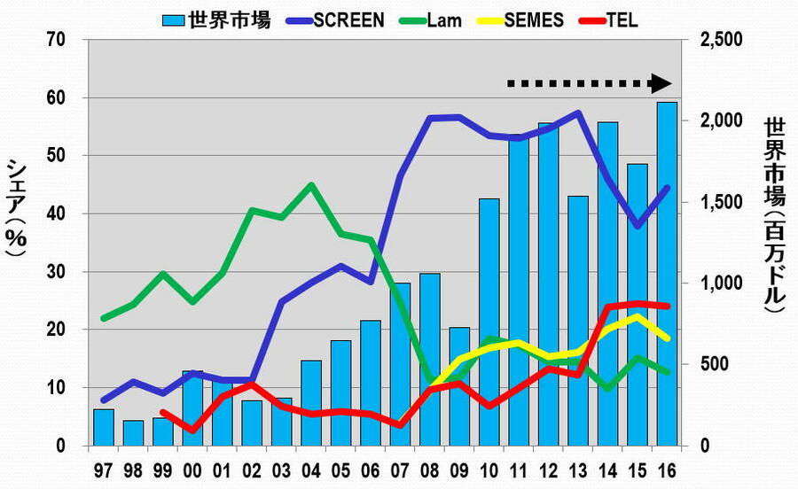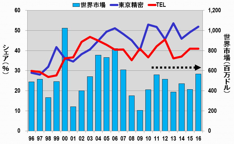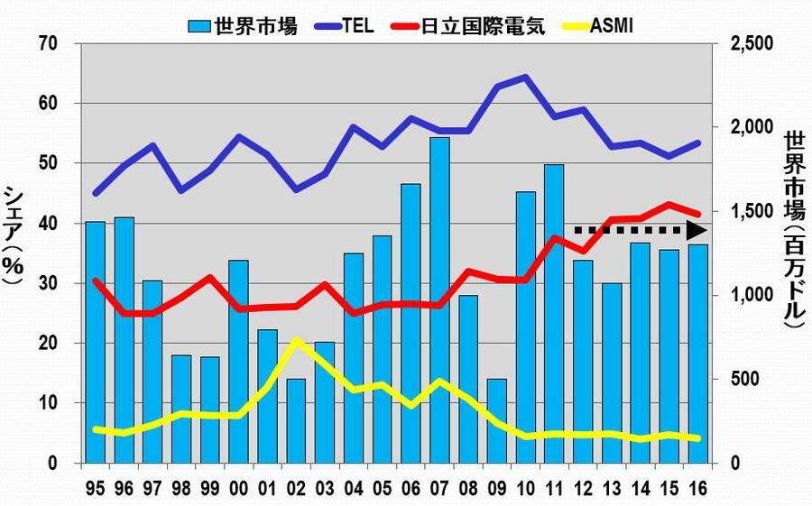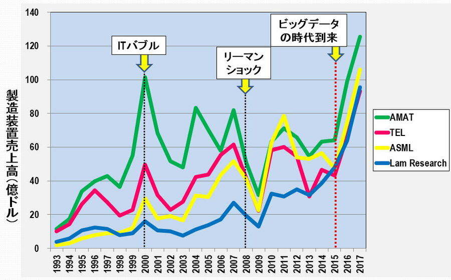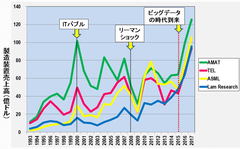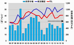 業績好調の東京エレクトロンが迎える正念場 IoT時代の本格的到来で半導体製造装置市場が飛躍的に拡大している(写真はイメージ) (画像1/12) 図1 東京エレクトロンの売上高、営業利益(率) (出所:東京エレクトロンのHPのIRデータを基に筆者作成) (画像2/12) 図2 半導体製造装置トップ4の比較(売上高) 出所:2013年までは電子ジャーナル『半導体製造装置データブック』、2014年以降は各社のIRデータ (画像3/12) 図3 2007年で規格化したトップ4の売上高比較 出所:2013年までは電子ジャーナル『半導体製造装置データブック』、2014年以降は各社のIRデータ (画像4/12) 図4 コータ・デベロッパ装置市場 出所:野村証券 和田木氏提供のデータを基に筆者作成 (画像5/12) 図5 ドライエッチング装置市場 出所:野村証券 和田木氏提供のデータを基に筆者作成 (画像6/12) 図6 CVD装置市場 出所:野村証券 和田木氏提供のデータを基に筆者作成 (画像7/12) 図7 バッチ式洗浄装置市場 出所:野村証券 和田木氏提供のデータを基に筆者作成 (画像8/12) 図8 枚葉式洗浄装置市場 出所:野村証券 和田木氏提供のデータを基に筆者作成 (画像9/12) 図9 熱処理装置市場 出所:野村証券 和田木氏提供のデータを基に筆者作成 (画像10/12) 図10 プローバ装置市場 出所:野村証券 和田木氏提供のデータを基に筆者作成 (画像11/12) 表1 TELの半導体製造装置の成長展望 (画像12/12) 業績好調の東京エレクトロンが迎える正念場 この写真の記事を読む