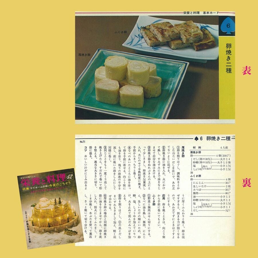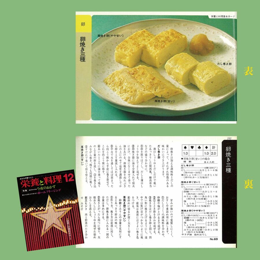 姿はさまざまでも定番の卵焼き、失敗しないコツは? 卵焼き。鶏卵をかき混ぜて味をつけたものを焼く。写真は『栄養と料理』1978(昭和53)年3月号表紙掲載のもの。 (画像1/5) 『栄養と料理』1944(昭和19)年2月号の表紙と「栄養と料理カード」。乾燥卵は40~60℃の温湯を加えて15~20分おいて戻してから使う。 拡大画像表示 (画像2/5) 1955(昭和30)年4月号。絵から巻きすで巻いて仕上げているのが分かる。味の素の広告も。 拡大画像表示 (画像3/5) 1970(昭和45)年12月号。卵は流動性があり、加える材料によって形を変えることができる。 拡大画像表示 (画像4/5) 1972(昭和47)年12月号。だし巻きは焼き色を付けない。厚焼き卵はおいしそうな焼き色が付いている。 拡大画像表示 (画像5/5) 姿はさまざまでも定番の卵焼き、失敗しないコツは? この写真の記事を読む