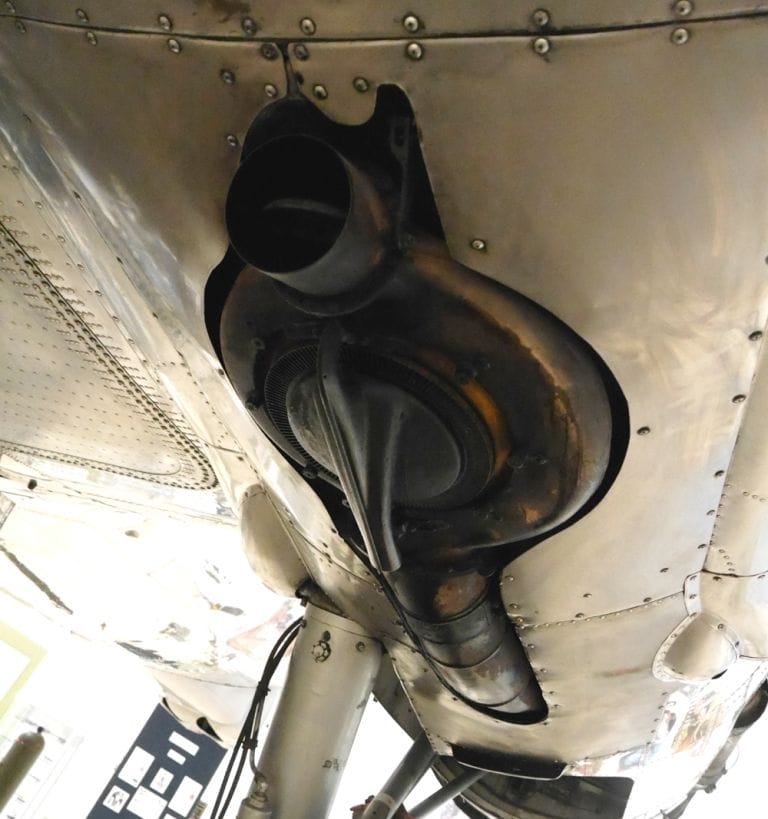 米軍機のターボチャージャー ターボチャージャーのエンジン排気を受ける部分は高温にさらされるので、ニッケルを用いた耐熱合金が必要である。写真のターボチャージャーも焼けたような雰囲気で、いかにも高温に耐えてきたという感じである。