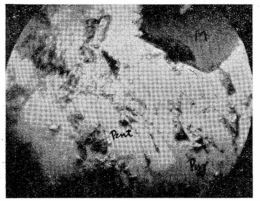 戦時中のニッケル鉱石の顕微鏡写真 何が写っているかよく分からないが、そんなものが大日本帝国のニッケル資源だった。pentと記入している部分がペントランド鉱というニッケルの鉱物である。顕微鏡写真であることから分かるとおり小さい。(出所:長野縣伊那郡靑崩峠天竜鑛山の含ニッケル磁硫鐵鑛鑛床について)
