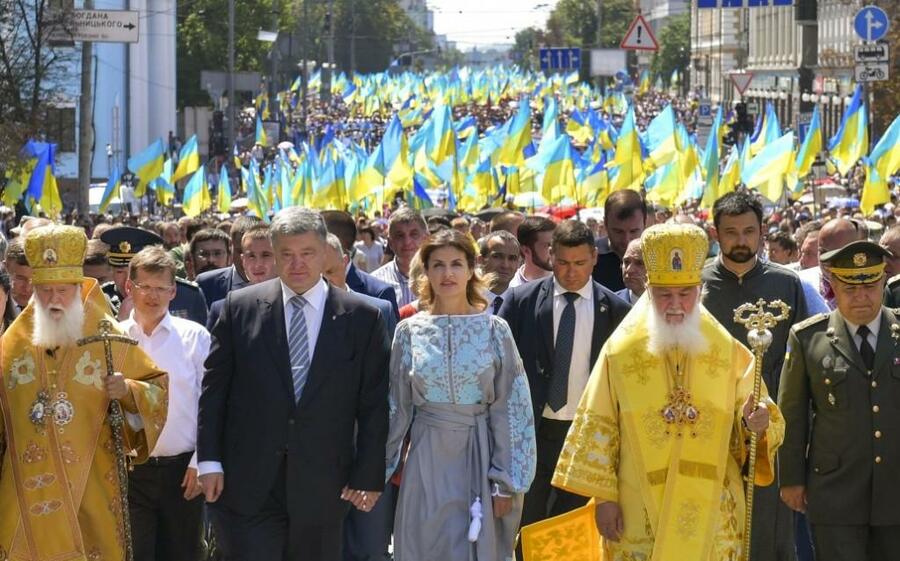 キエフ公国キリスト教受容1030周年十字行で行進する大統領夫妻とキエフ総主教(ウクライナ大統領府公式サイトより)