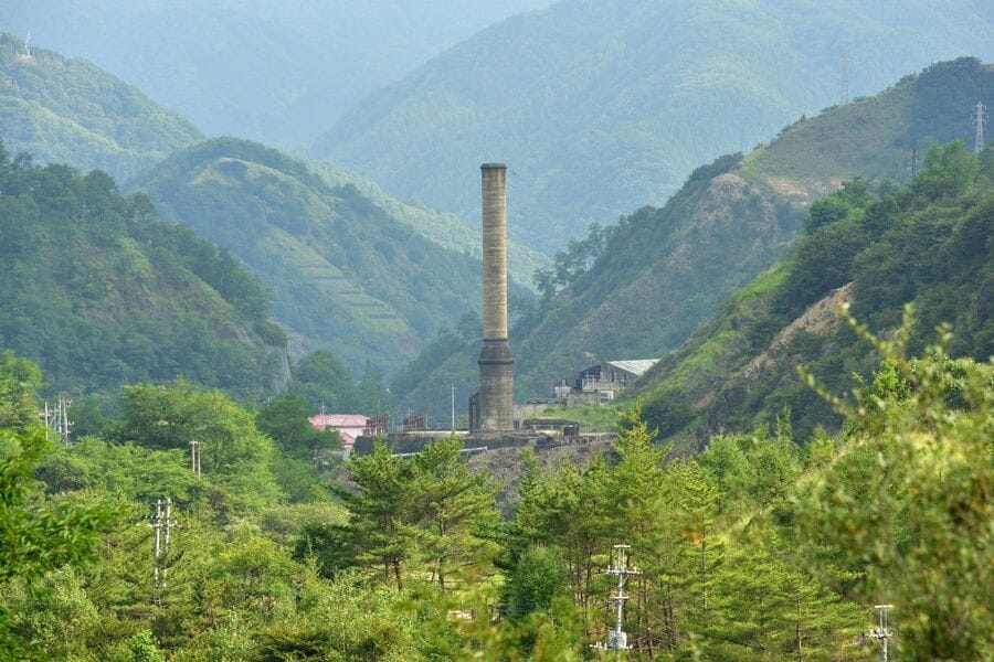 足尾銅山 本山精錬所跡の煙突。周辺には、今も山肌が露出している部分がある。
