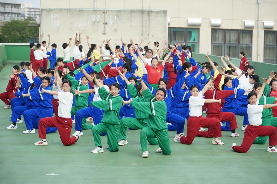 吹奏楽部とは思えない練習風景。学年で分けられたジャージは、世代の象徴となっている(著者撮影)。