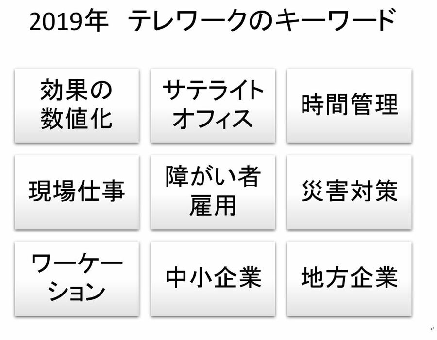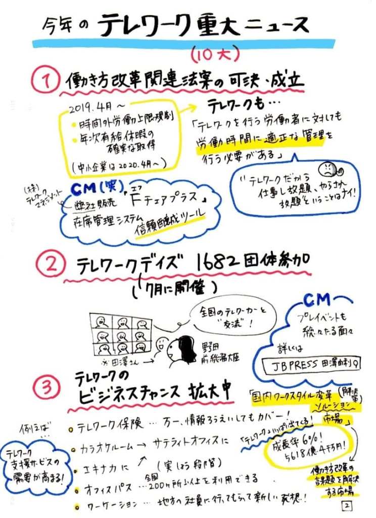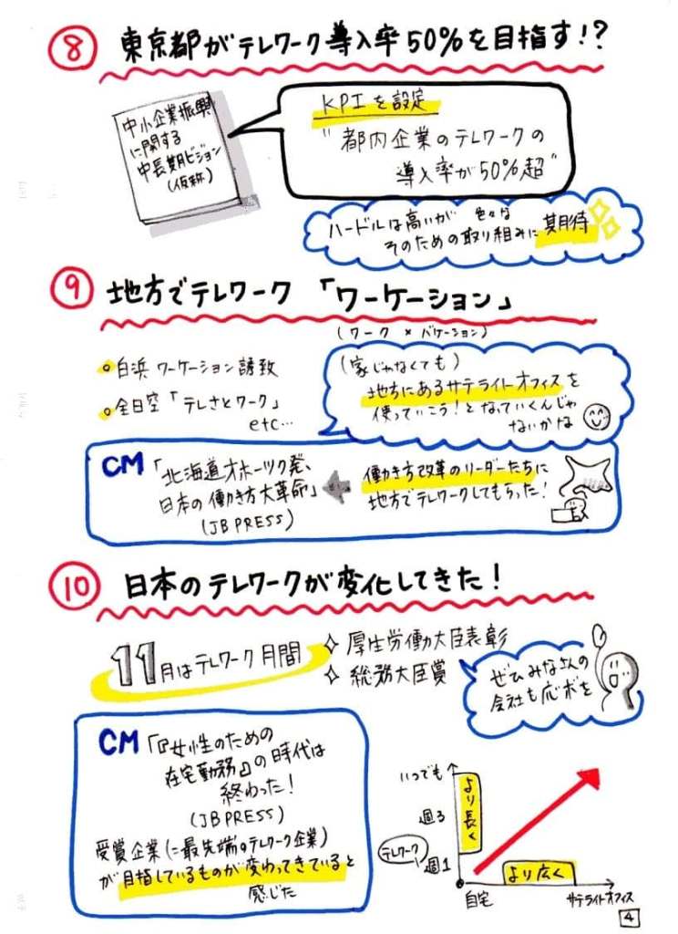 2019年の「テレワーク」はどうなる? 本稿のベースとなったライブ配信セミナーのグラフィックスレコーディング。 (すべての絵は、最終ページに掲載) (画像1/11) (画像2/11) (画像3/11) (画像4/11) 「中小企業振興に関する中長期ビジョン(仮称) 中間のまとめ」より(http://www.sangyo-rodo.metro.tokyo.jp/plan/shoko/cat5390/index.html) (画像5/11) (画像6/11) (画像7/11) (画像8/11) (画像9/11) (画像10/11) (画像11/11) 2019年の「テレワーク」はどうなる? この写真の記事を読む