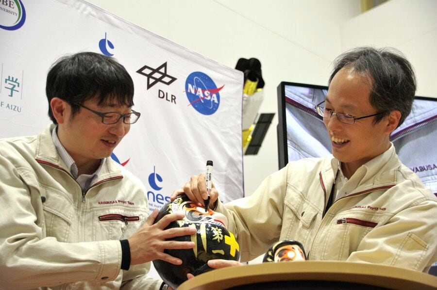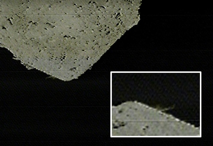 はやぶさ2はどんなクレーターを作れたのか? 4月5日のSCI運用の報告の場で、DCAM3からの画像を見て笑顔を見せたはやぶさ2チーム。 (画像1/6) 4月5日、衝突実験当日に公開された分離カメラ(DCAM3)の画像。衝突装置(SCI)起爆約2秒後にアナログカメラで撮影された。リュウグウ表面からの噴出物が捉えられている。(提供:JAXA、神戸大、千葉工大、産業医科大、高知大、愛知東邦大、会津大、東京理科大) (画像2/6) 4月11日に公開されたDCAM3のデジタルカメラの画像。SCI作動約3秒後に撮影。アナログカメラの画像より鮮明に噴出物が捉えられている。(提供:JAXA、神戸大、千葉工大、産業医科大、高知大、愛知東邦大、会津大、東京理科大) (画像3/6) 【動画:画像をクリックして再生】TIR(中間赤外カメラ)によって撮影されたSCI。画像の上方がリュウグウの北極方向。はやぶさ2は上昇しながら、切り離したSCIがリュウグウに向かって降りていく様子を撮像している。(提供:JAXA、足利大学、立教大学、千葉工業大学、会津大学、北海道教育大学、北海道北見北斗高校、産業技術総合研究所、国立環境研究所、東京大学、ドイツ航空宇宙センター、マックスプランク研究所、スターリング大学) (画像4/6) 4月5日13時15分頃、はやぶさ2から届いた画像からSCI分離を確認、喜ぶチームメンバー。(提供:ISAS/JAXA) (画像5/6) 運用成功の喜びを胸に、願掛けのだるまへ目を書き入れる津田雄一プロマネ(右)と佐伯孝尚氏(左)。 (画像6/6) はやぶさ2はどんなクレーターを作れたのか? この写真の記事を読む
