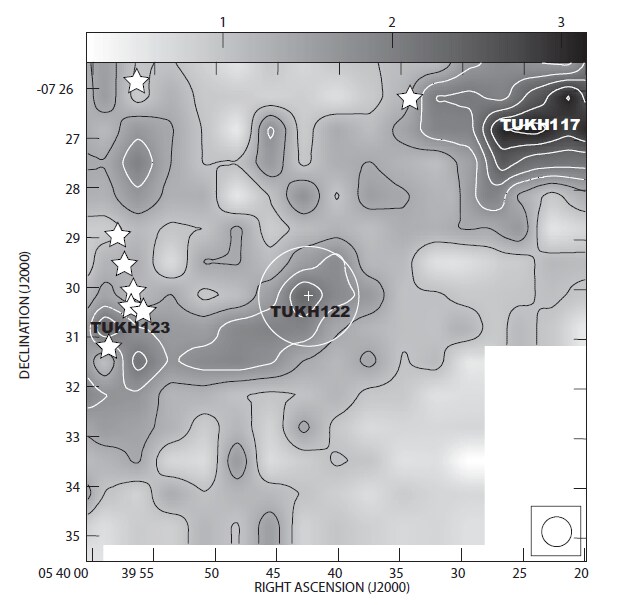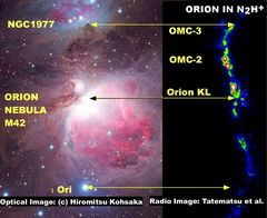見えない宇宙を探る! 電波望遠鏡って何してるの? 図1:筆者が所長をつとめる野辺山宇宙電波観測所の45m電波望遠鏡。ハイテク技術と、ブラックホールの発見などの電波天文学における成果によりIEEEマイルストーンに認定された。 (画像1/5) 図2:可視光で見たオリオン座(左)と、電波で観測された「分子雲」を重ねたもの(阪本成一氏提供)。電波写真は、電波強度を疑似カラーで色付けして表しており、紫、青、緑、黄、赤と変わるに応じ、電波強度が強くなっている。三つ星の下に小三つ星がたてに並んでおり、その真ん中の赤いのが「オリオンの大星雲」。オリオンの大星雲のところで、電波が強くなっており、電波で見える「分子雲」が濃くなっていることが分かる。 (画像2/5) 図3:左が可視光で見たオリオンの大星雲(上坂浩光氏提供)と、同じ領域を野辺山宇宙電波観測所の45m電波望遠鏡で取得した電波写真(立松健一)。電波写真の色は電波強度を表す。 拡大画像表示 (画像3/5) 図4:野辺山45m電波望遠鏡で見つけた、もうすぐ星団が生まれそうなオリオン座の分子雲のかたまりTUKH122(立松ほか)。隣のかたまりTUKH123では、すでに星の赤ちゃん(星印)が数個生まれている。 (画像4/5) 図5:アルマ望遠鏡を用いて観測したTUKH122(大橋聡史ほか)。星団の誕生の場と考えられる。 (画像5/5) 見えない宇宙を探る! 電波望遠鏡って何してるの? この写真の記事を読む