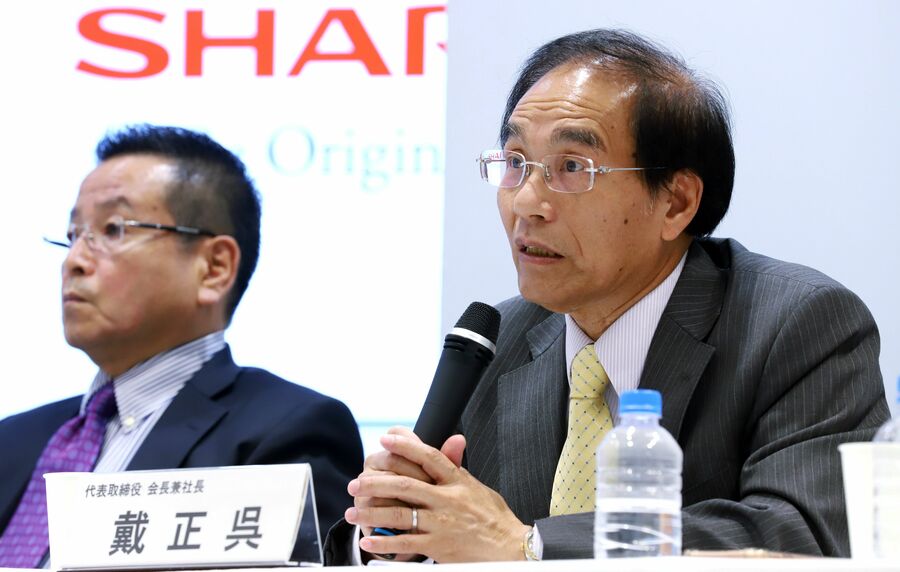 6月11日、シャープの事業方針説明会に登場した会長兼社長の戴正呉氏(右)。左は石田佳久副社長(写真:つのだよしお/アフロ)