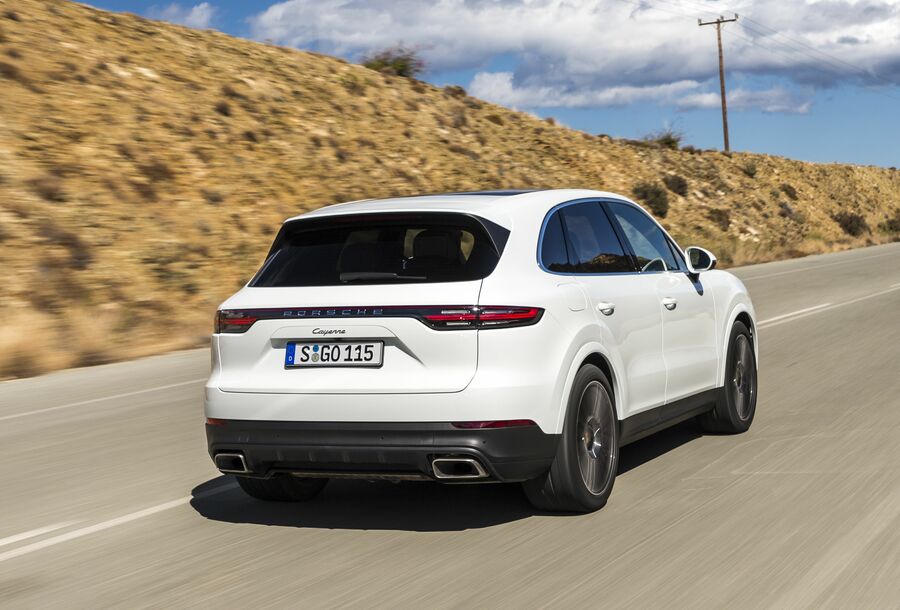 上が標準モデルの『カイエン』で、下が『カイエン クーペ』。後方から2台を比べると、クーペモデルはより車高が低く、ワイドなシルエットになっている。写真提供=Porsche AG