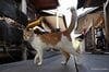 ペナン島水上の家で扇風機に当たる猫とおばあさん