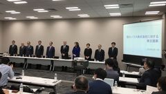 17日16時から行われた「積水ハウス」の和田勇・前会長兼CEOらによる記者会見。左から5番目が和田氏(筆者撮影)