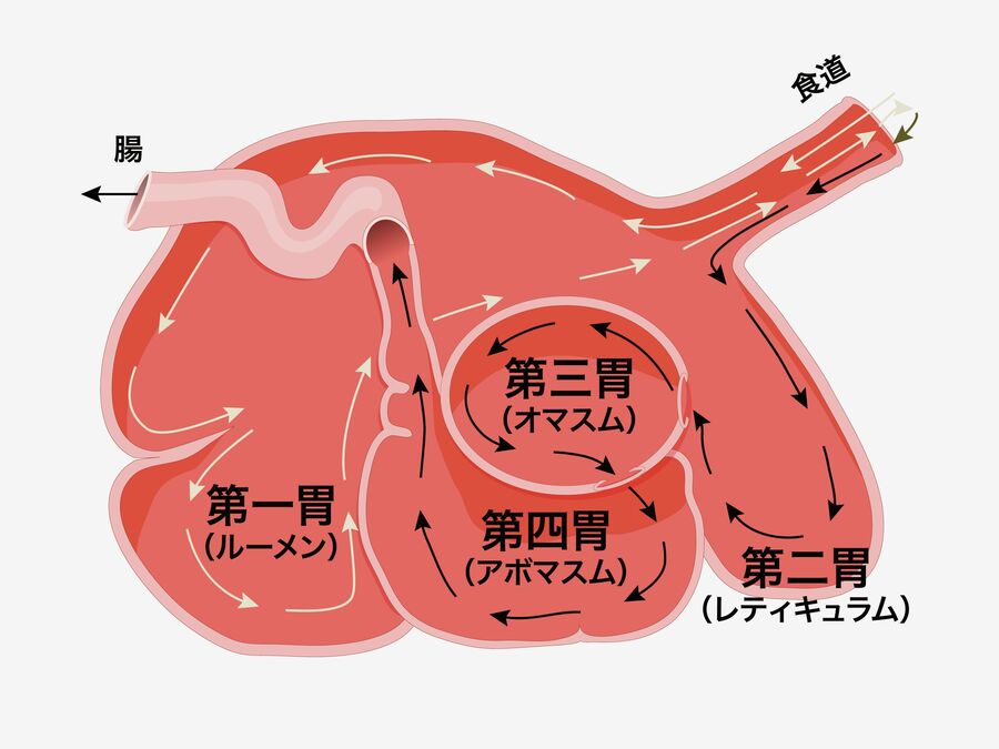 ウシの4つの胃による反芻の仕組み。食べた草などが白矢印の経路で反芻された後、黒矢印の経路へ。