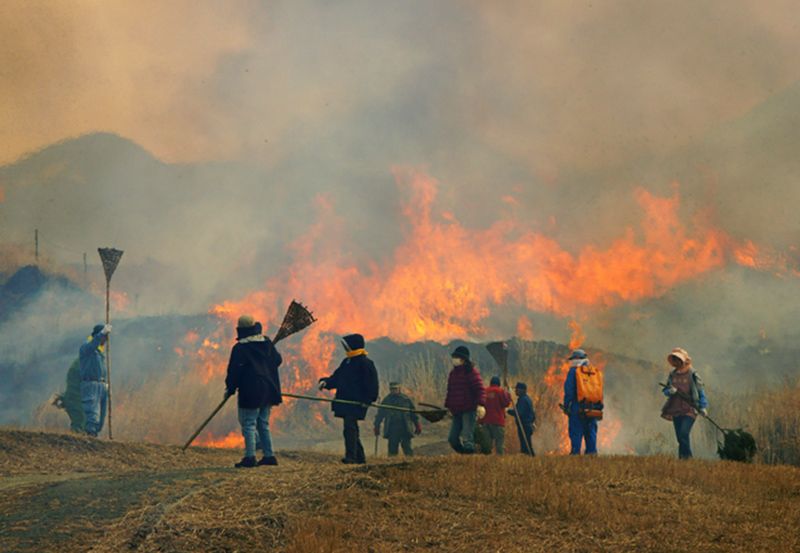野焼き。早春、野の枯れ草を焼いて、草の芽がよく出るようにする。