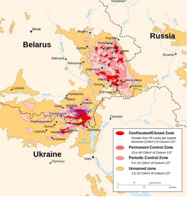 原発事故を隠蔽したソ連は崩壊、中国の命運はいかに チェルノブイリ原発4号機を覆う巨大シェルターの正式稼働開始式典に出席したウクライナのヴォロディミル・ゼレンスキー大統領(左)(2019年7月10日、提供:Ukrainian Presidential Press Service/ロイター/アフロ) (画像1/5) チェルノブイリ原発事故後の第3原子炉と第4原子炉(出所:Wikipedia英語版) (画像2/5) チェルノブイリ原子力発電所の位置。左上囲み内の赤い印、キエフの北西。赤い部分はウクライナ、その北はベラルーシ(出所:Wikipedia) (画像3/5) セシウム137の濃度に基づく放射能汚染地域(出所:Wikipedia) 拡大画像表示 (画像4/5) リポート「Coronavirus Compensation? Assessing China’s Potential Culpability And Avenues Of Legal Response」の表紙 (画像5/5) 原発事故を隠蔽したソ連は崩壊、中国の命運はいかに この写真の記事を読む