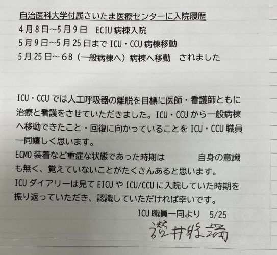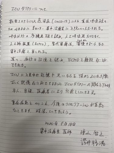 ECMOを離脱した患者の『ICUダイアリー』(ICU日記)に励ましのメッセージを送る。