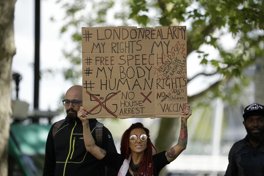 「反ロックダウン」「反ワクチン」「反5G」のプラカードを掲げる女性(写真:AP/アフロ)