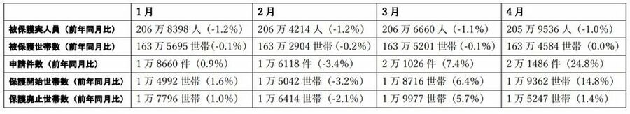労働力人口、休業者、生活保護世帯の増加が示す意味 写真:ロイター/アフロ (画像1/7) 表1 労働力の推移:季節調整値(単位:万人、カッコ内は前月比) (画像2/7) 本コラムは新潮社の会員制国際情報サイト「新潮社フォーサイト」の提供記事です。フォーサイトの会員登録はこちら (画像3/7) 表2 雇用人員判断DI(「過剰」 - 「不足」・%ポイント) (画像4/7) 表3 新卒採用計画(全産業)〈6、12月調査のみ〉(前年度比・%) (画像5/7) 表4 生活保護の推移 拡大画像表示 (画像6/7) (画像7/7) 労働力人口、休業者、生活保護世帯の増加が示す意味 この写真の記事を読む