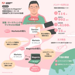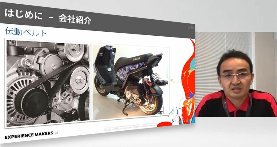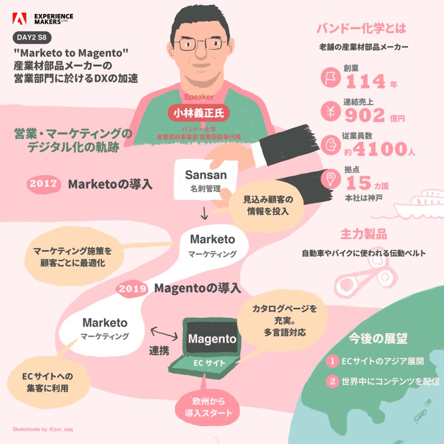 "Marketo to Magento" 産業財部品メーカーの営業部門におけるDXの加速 バンドー化学株式会社 産業資材事業部 営業部 部長代理 小林義正氏 (画像1/3) バンドー化学の刷新後のECサイト (画像2/3) セミナーの内容をまとめたスケッチノート (画像3/3) "Marketo to Magento" 産業財部品メーカーの営業部門におけるDXの加速 この写真の記事を読む