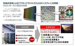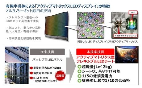 東大発の技術が空間演出や情報伝達を変える 株式会社オルガノサーキット代表取締役社長の中原和幸さん。「既存のディスプレイでは不可能だった新しいソリューションを提供したい」と、意気込みを語ります (画像1/7) オルガノサーキットは、東京大学大学院新領域創成科学研究科の竹谷純一教授が開発した有機半導体素子技術を基盤に、超大型・軽量のフレキシブルサイネージディスプレイを製造する技術の実用化に成功しました (画像2/7) 柔らかい基盤の上に印刷のように半導体を作る技術を開発したことで、従来のLEDパネルが持っていたいろいろな課題を解決することができました (画像3/7) 50センチ角のパネルをつなげることで、巨大なディスプレイを作ることが可能です (画像4/7) 空港や駅などの大空間に掲示されているバナーに置き換えれば、新しい広告需要を喚起することが期待できます。また、緊急時や災害時には乗客に必要な情報をリアルタイムで表示することも可能です (画像5/7) コンサートホールなどに利用すれば、観客の満足度を高めることができます (画像6/7) ホテルの窓にオルガノサーキットのディスプレイを貼り付ければ、新しい空間演出の可能性が広がります (画像7/7) 東大発の技術が空間演出や情報伝達を変える この写真の記事を読む