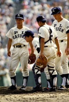 10回表。マウンドに集まるPLナイン(写真:岡沢克郎/アフロ)