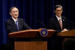 1月7日、1都3県に対する緊急事態宣言の発出後に記者会見する菅義偉首相。右は諮問委員会の尾身茂会長(写真:代表撮影/ロイター/アフロ)