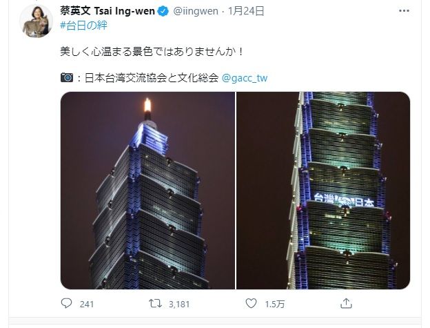 台湾・蔡英文総統が「日本語ツイート」を続ける理由 昨年10月10日、台北市の総統府前で開かれた建国記念日に当たる「双十節」の式典で演説する蔡英文総統(写真:AP/アフロ) (画像1/4) 蔡英文総統が日本語メッセージと共にツイッターに載せた超高層ビル「台北101」のライトアップイベントの様子(蔡英文ツイッター @iingwen より) (画像2/4) 蔡英文総統による日本語ツイート(蔡英文総統のツイッター @iingwen より) (画像3/4) 台湾新幹線。現在は東芝・川崎重工業などが製造したJR東海の「700系」を台湾向け仕様にした「700T」が走っているが、台湾高速鉄路が新たに進めている車両調達で、東芝・日立が提案する新型車両「N700S」は「高額すぎる」とされ、購入交渉が打ち切られる事態となっている (画像4/4) 台湾・蔡英文総統が「日本語ツイート」を続ける理由 この写真の記事を読む