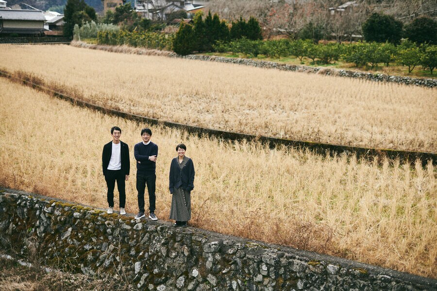 神山まるごと高専の学生寮建設予定地に立つ寺田親弘理事長、大蔵峰樹学校長、山川咲クリエイティブディレクター兼理事