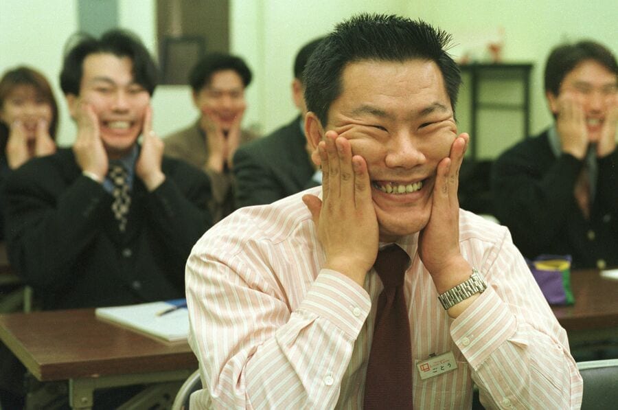 「笑い方教室」で笑顔づくりの練習に励むビジネスマンたち(写真:橋本昇)拡大画像表示
