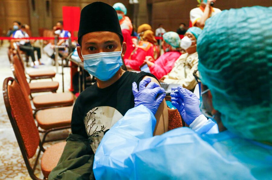 「ワクチンに豚由来成分」インドネシアでハラル論争 3月1日、ジャカルタ郊外のショッピングモールで、従業員と取引業者向けに中国シノバック製のワクチン接種が実施された(写真:ロイター/アフロ) (画像1/2) 1月13日、インドネシアで最初にコロナワクチン接種を受けるジョコ・ウィドド大統領(提供:Indonesian Presidency/Abaca/アフロ) (画像2/2) 「ワクチンに豚由来成分」インドネシアでハラル論争 この写真の記事を読む