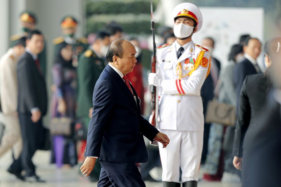 対中包囲網の鍵握るベトナムが日本に送るラブコール ベトナム・ハノイで開催された第13回共産党全国大会の閉会式に出席するため、ナショナル・コンベンション・センターに到着したベトナムのグエン・スアン・フック首相(中央)(2021年2月1日写真:AP/アフロ) (画像1/2) (画像2/2) 対中包囲網の鍵握るベトナムが日本に送るラブコール この写真の記事を読む