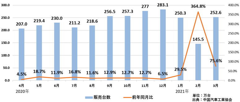 中国の月次自動車販売台数推移(2020年4月~2021年3月、「前年同月比」は増分を示す)